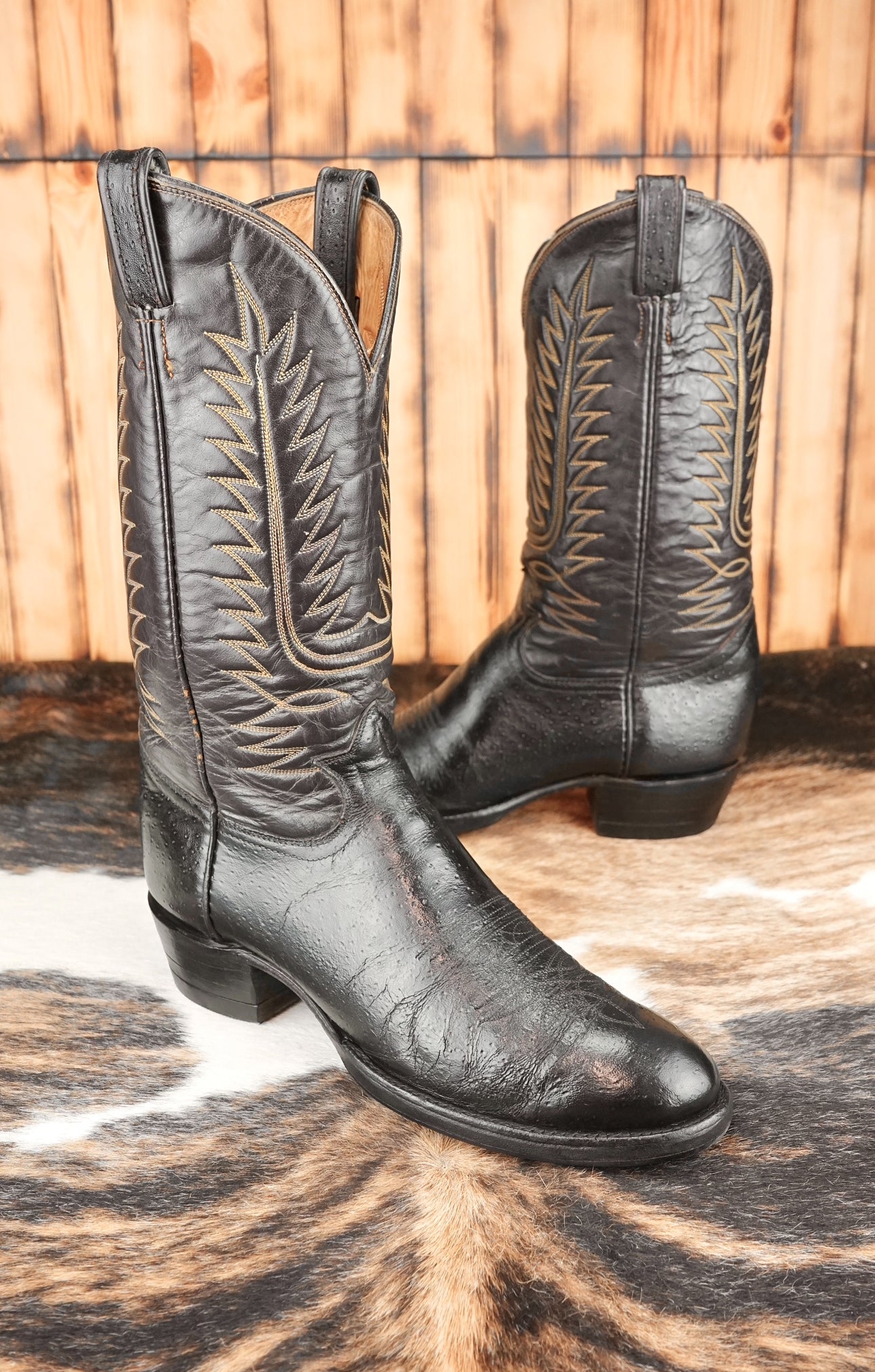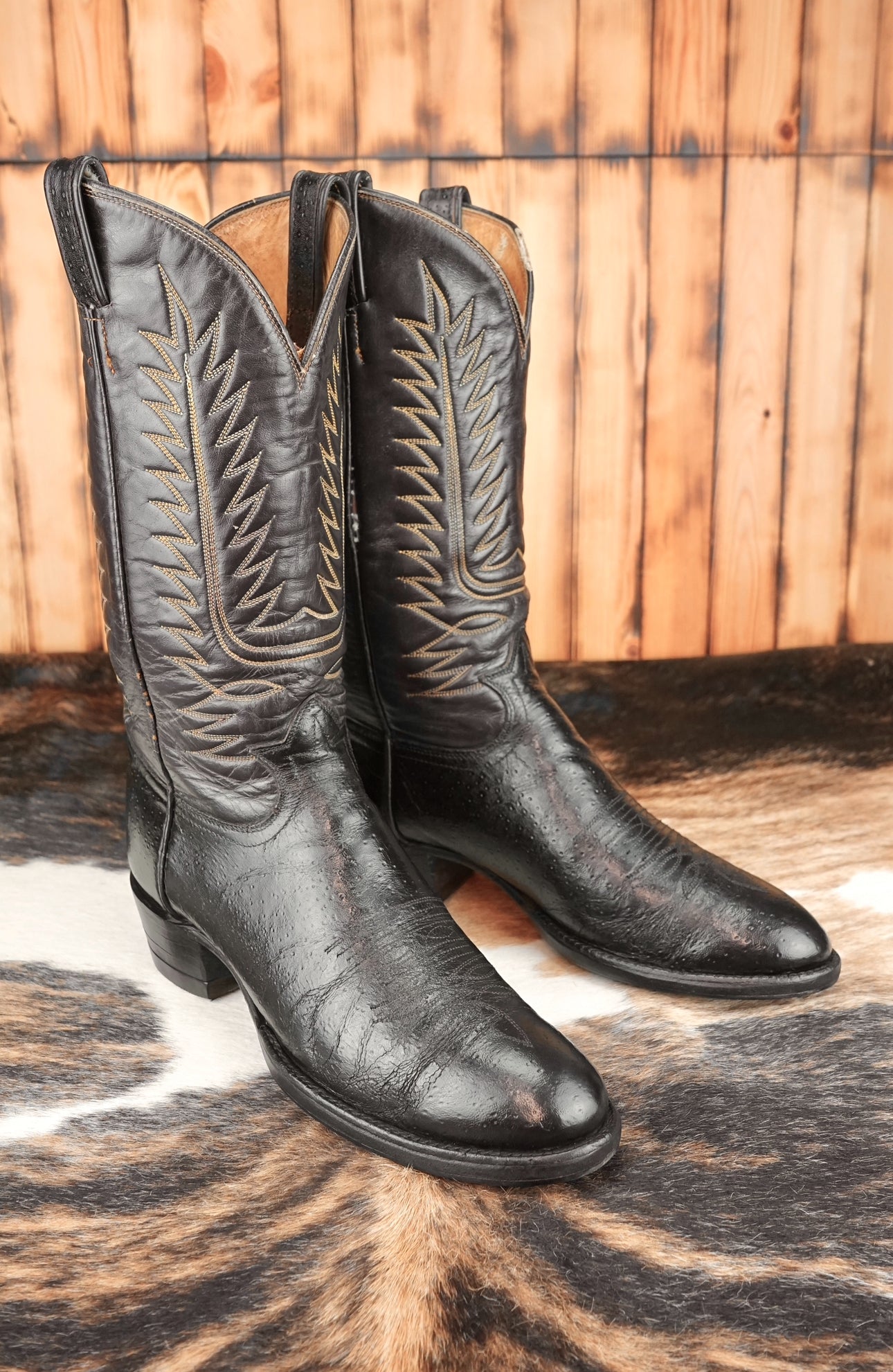 Pre ban pre 1973 Tony Lama size is 10.5B same as 9D possibly 9.5D , these boots are not perfect by any means . Leather has been dyed black , there are some splitting , cracks & some piping has been torn . Soles consists of rubber half soles ( life savers ) and newer style heel caps . Boots are wearable as they sit and rare but time and wear are definitely shown .